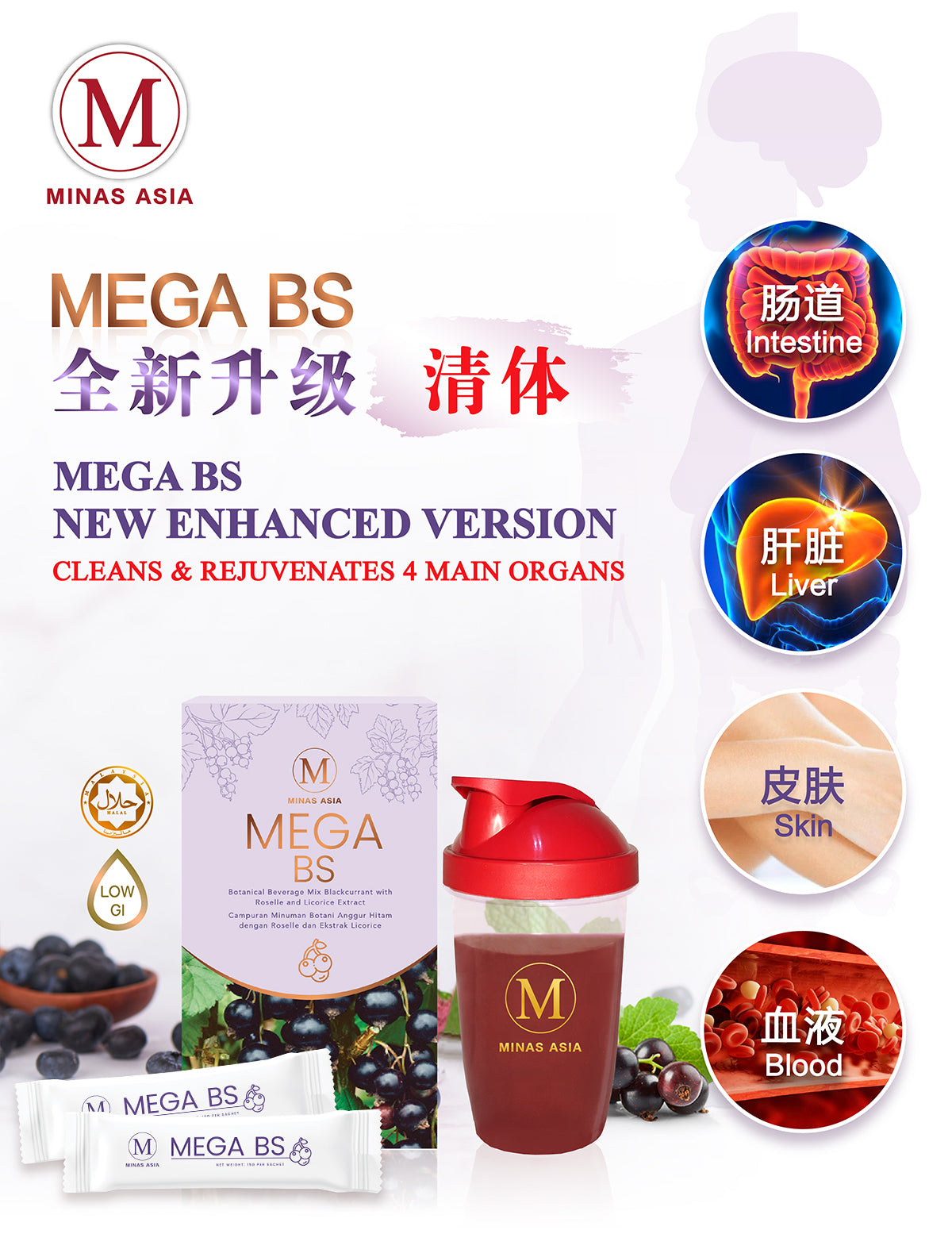 Mega BS 有助于清体并焕活身体四大主要器官,包括肠道、肝脏、皮肤和血液。