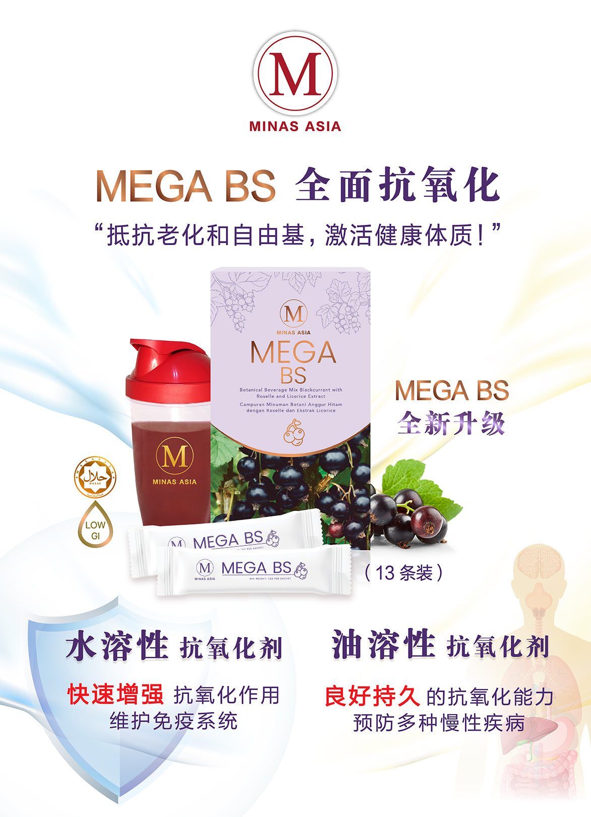 用大自然的优质防护力为身体充能。MEGA BS 富含两种强效抗氧化剂,帮助从体内对抗老化,让你焕发活力,神清气爽。